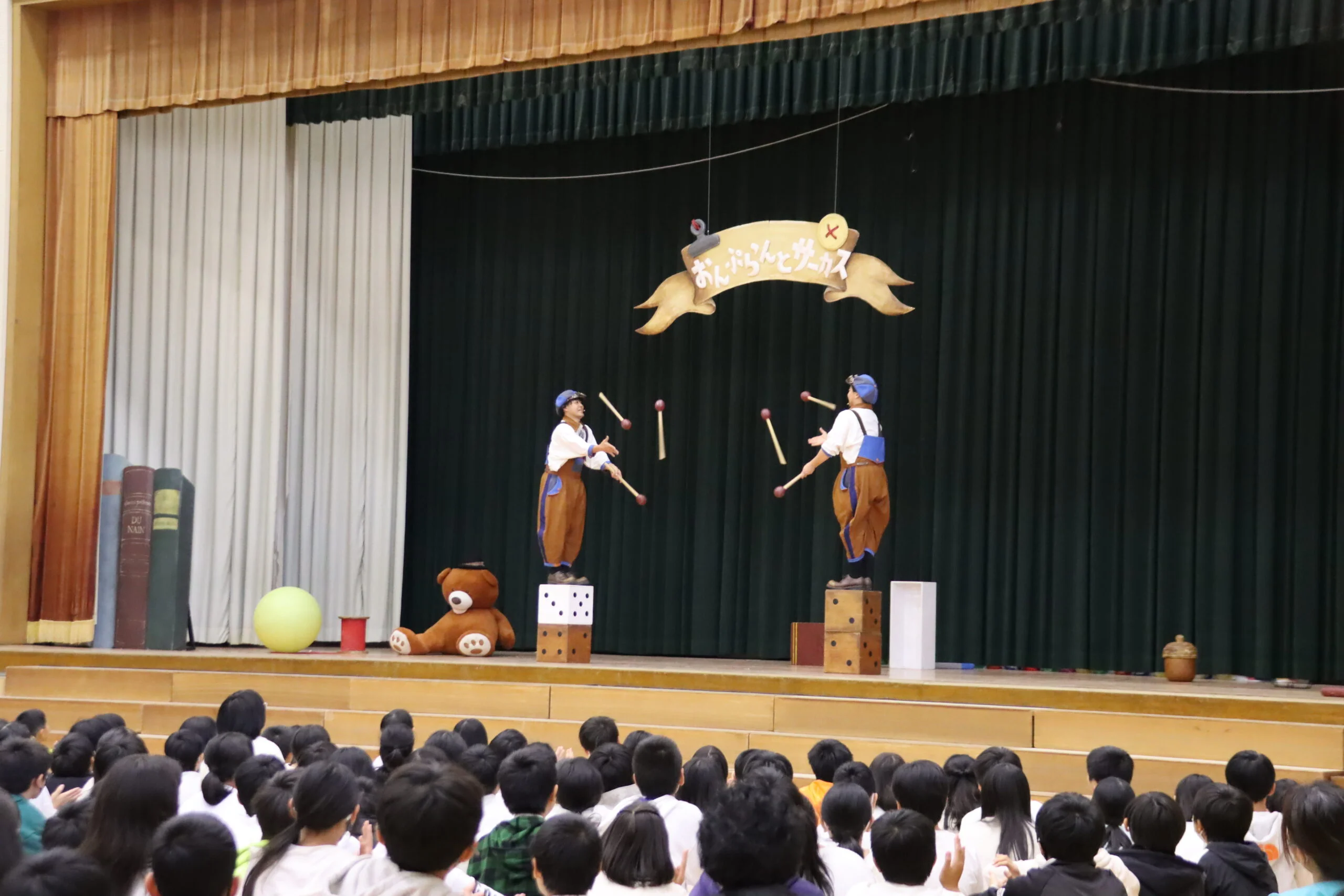 今まで使ったサイコロやマッチ箱を組み合わせたバランスジャグリングで、ドキドキハラハラのラストをお届けします。生徒達は自然と手拍子で応援、この日1番の一体感で会場はとても盛り上がります。