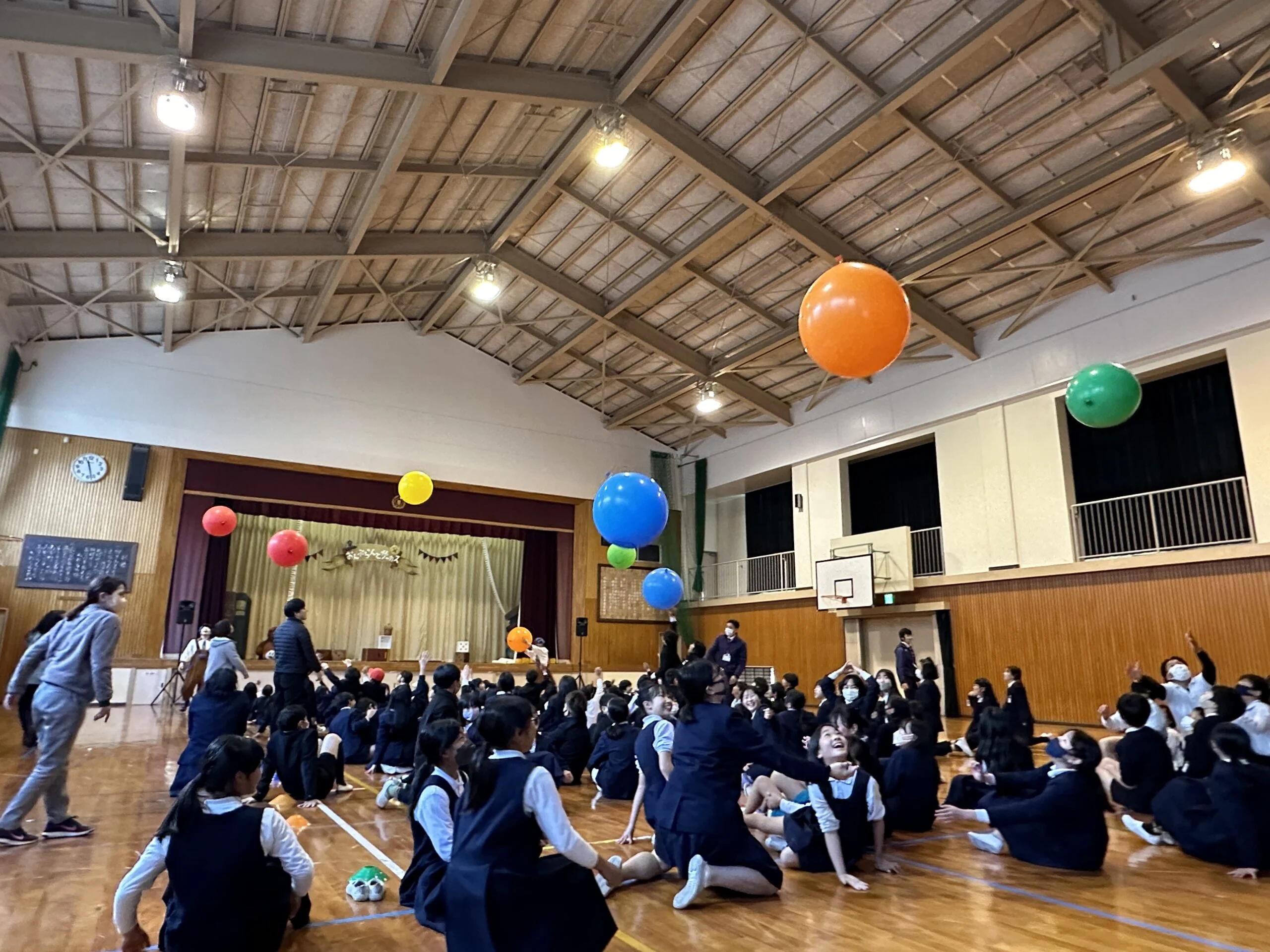 最後は会場全体がステージに!客席に飛びたしてきた風船をみんなで触ったり、体感しながら楽しむ演目です。先生や、生徒達も一緒に楽しむ特別なフィナーレ。